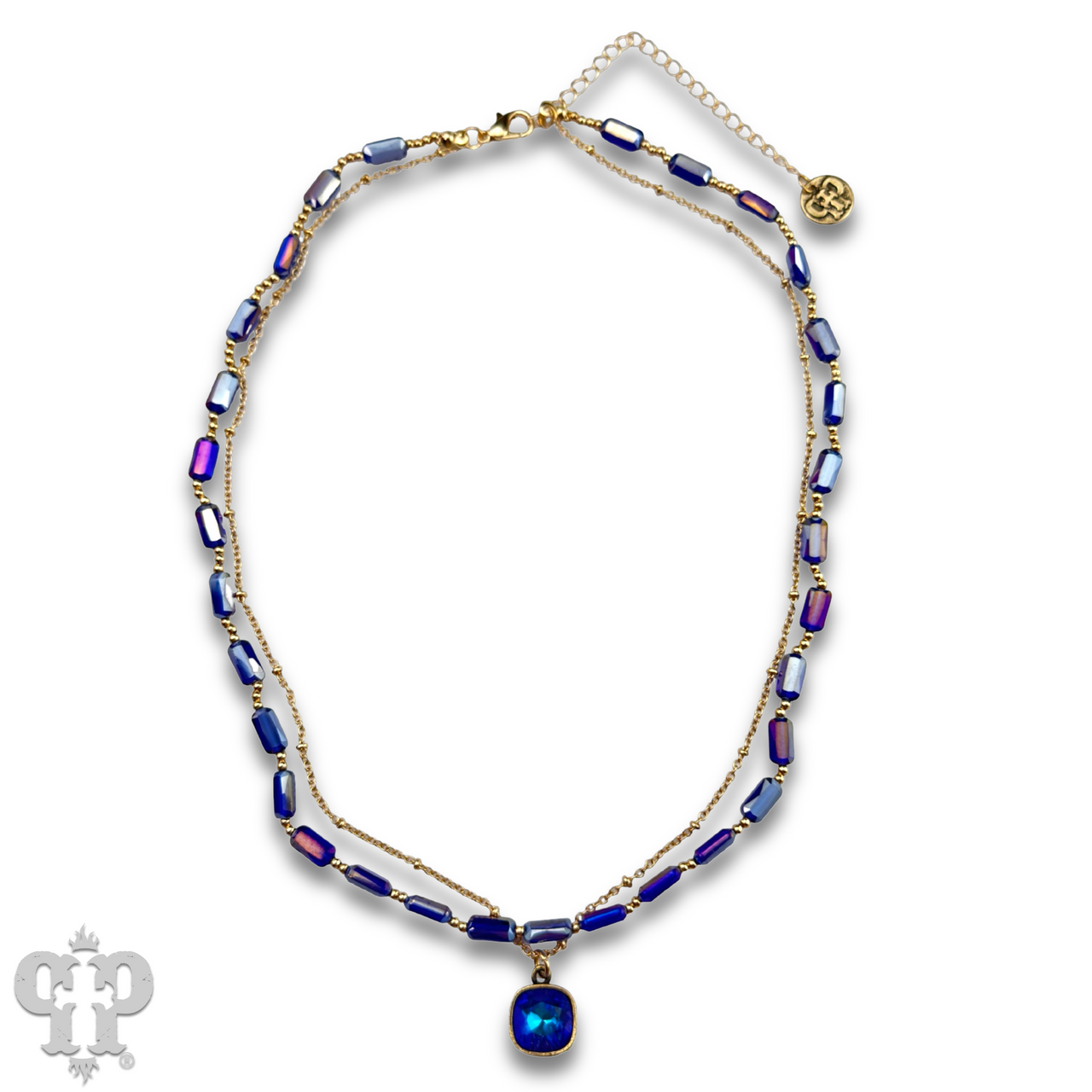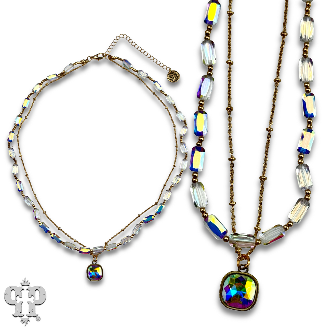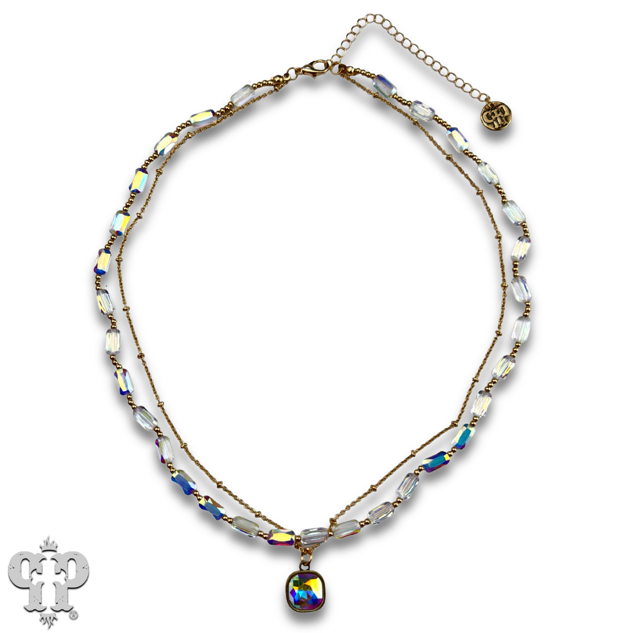 This two-strand necklace has iridescent, faceted, rectangle beads.  The pendant is an Austrian crystal in a setting custom made for Pink Panache in the USA.