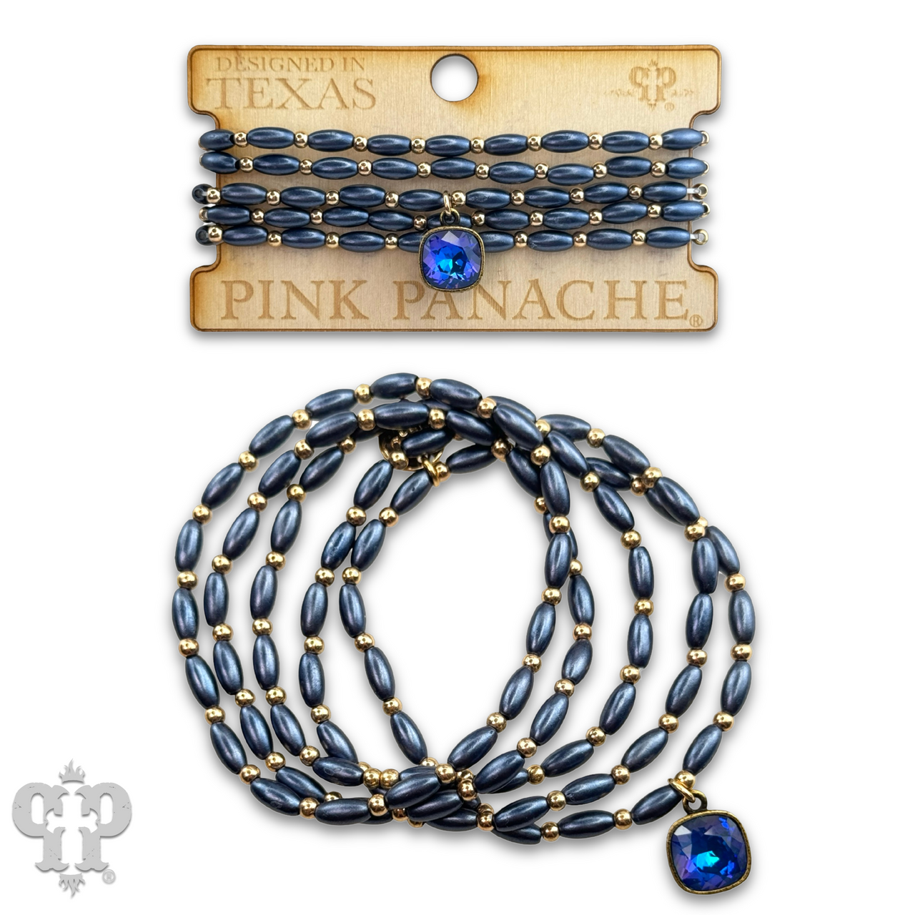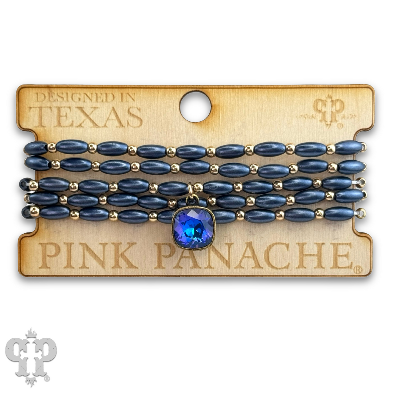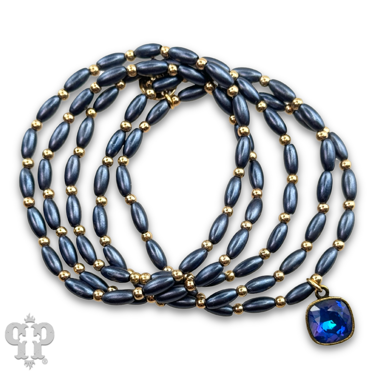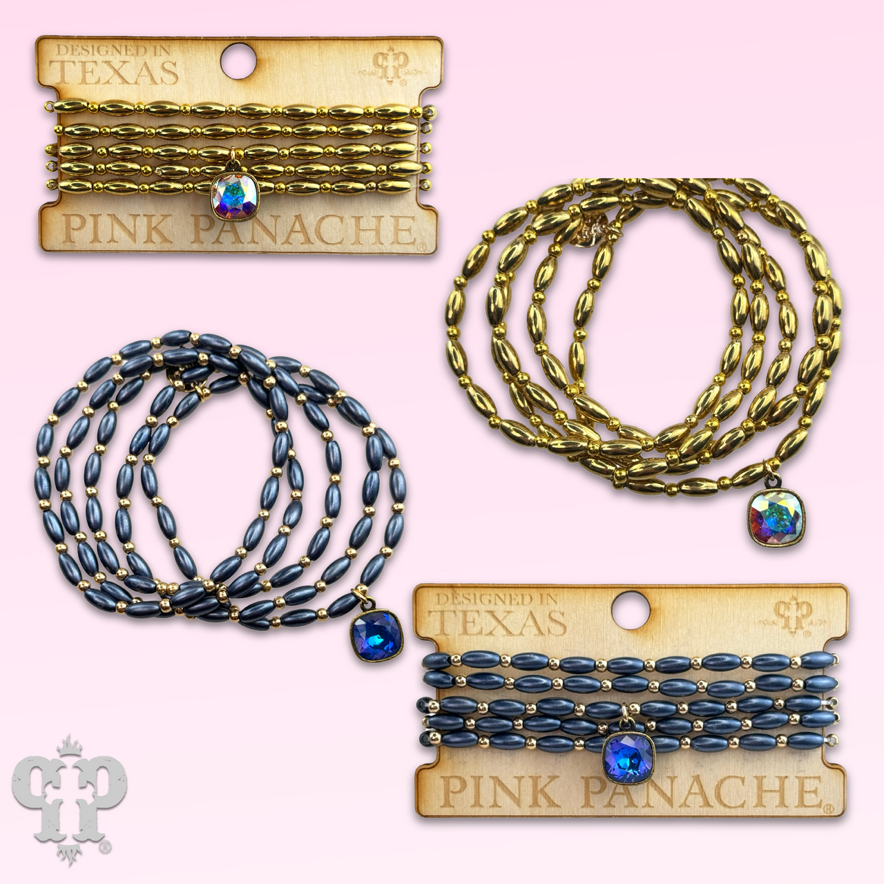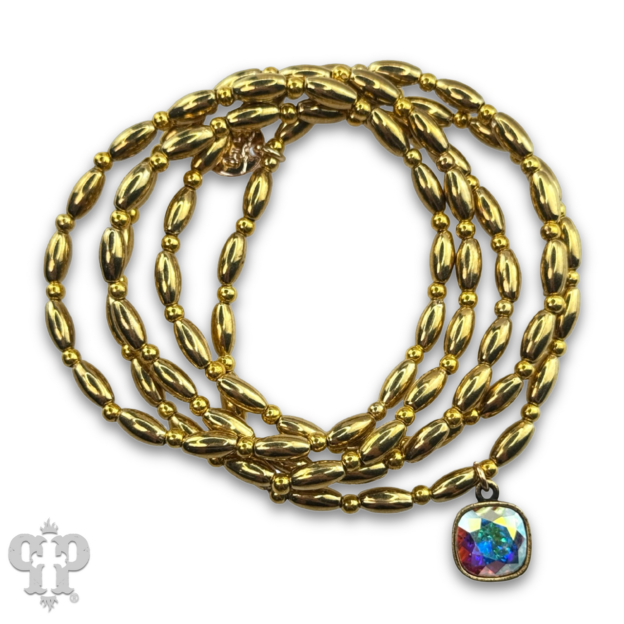 This bracelet set has five strands of rice shape beads with round gold tone beads in between. The charm is a 10 mm Austrian crystal in a setting custom made for Pink Panache in the USA. It stretches for ease of wear.