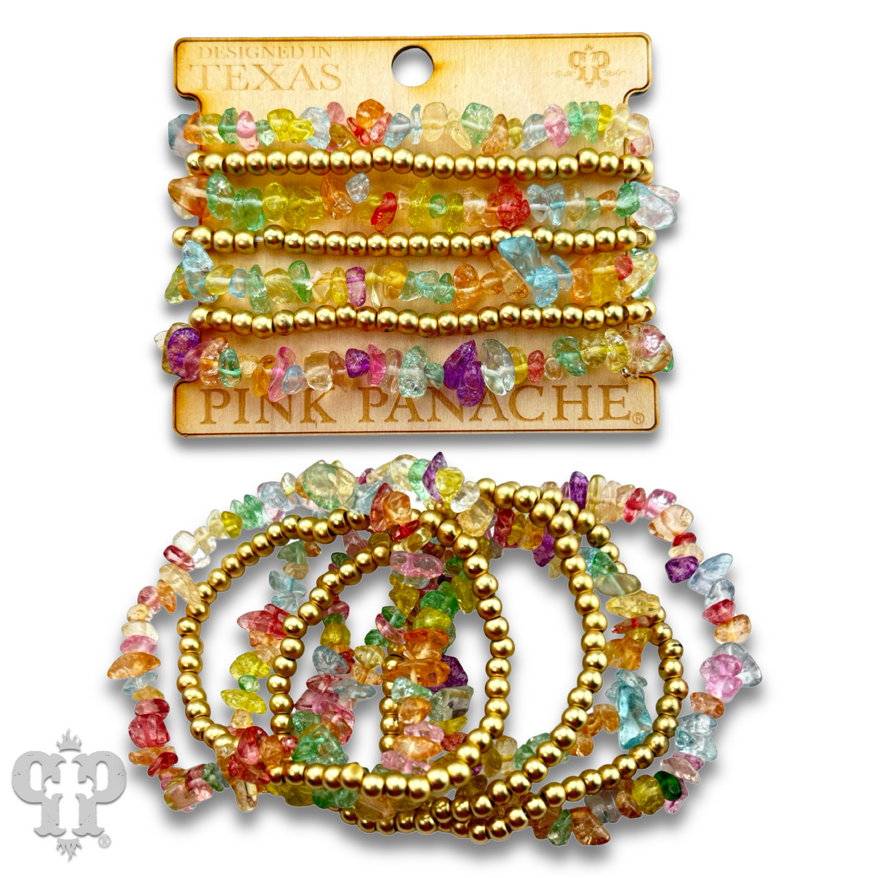 This bracelet has seven strands of gold and multi-color chip beads. It stretches for ease of wear.