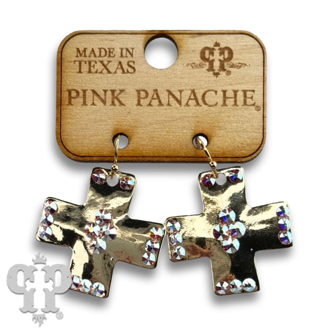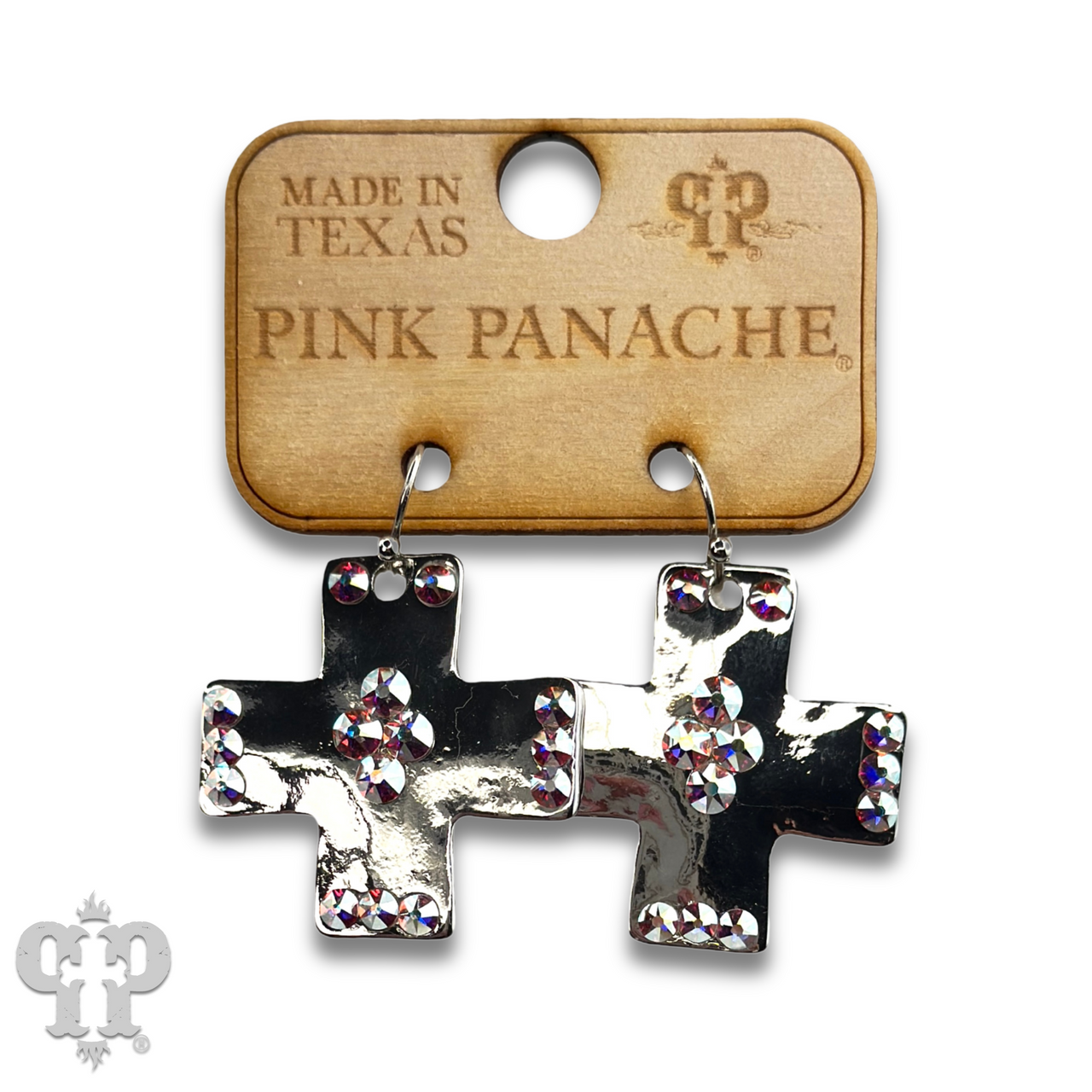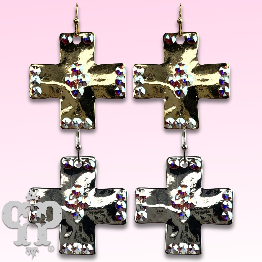 These square cross shape earrings have a shiny metal tone finish. They feature handset Austrian crystals. They will make an impact on any outfit!