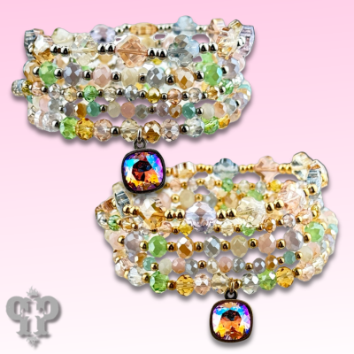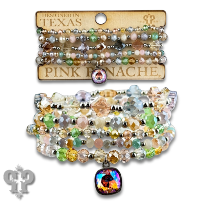 This bracelet set has five strands of light spring color faceted glass beads in varying shapes and sizes. The charm is a 10mm light rose shimmer Austrian crystal in a setting custom made for Pink Panache in the USA. Easily stretches on and off. One size fits most.