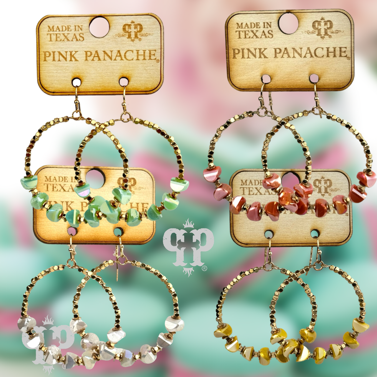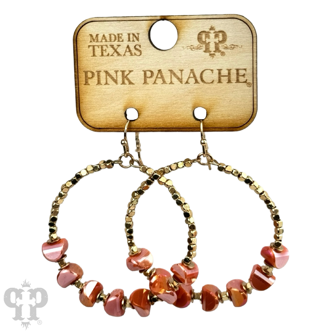 This beautiful earring features iridescent wavy beads with small square gold tone beads arranged in a circle. It dangles elegantly from a french hook.