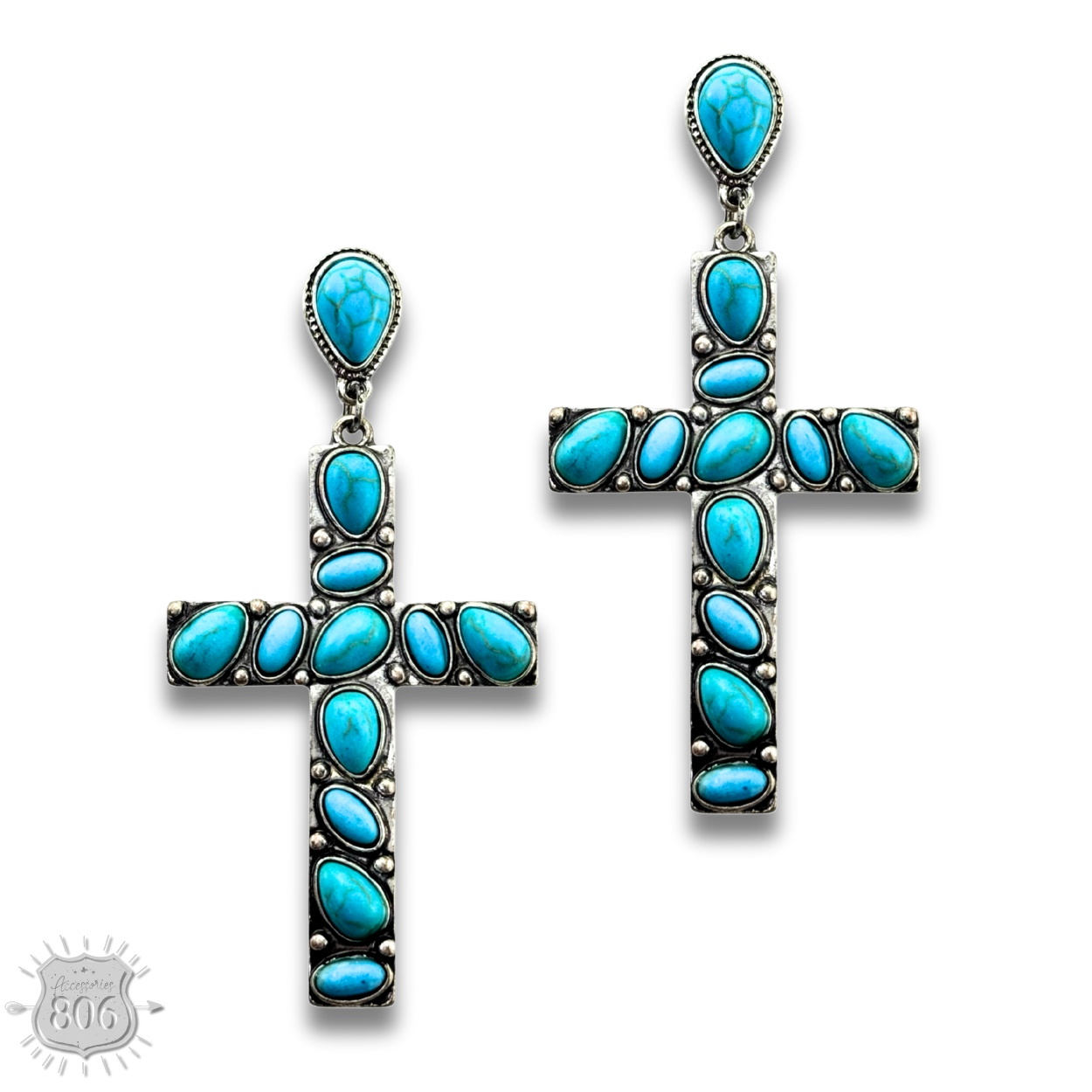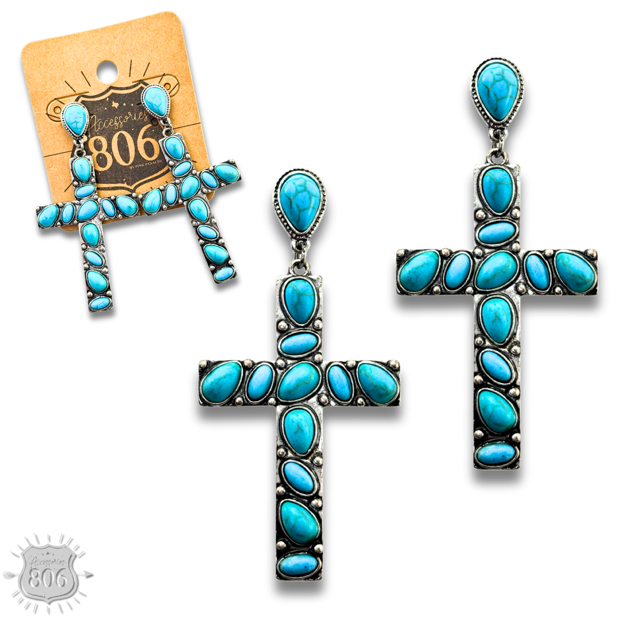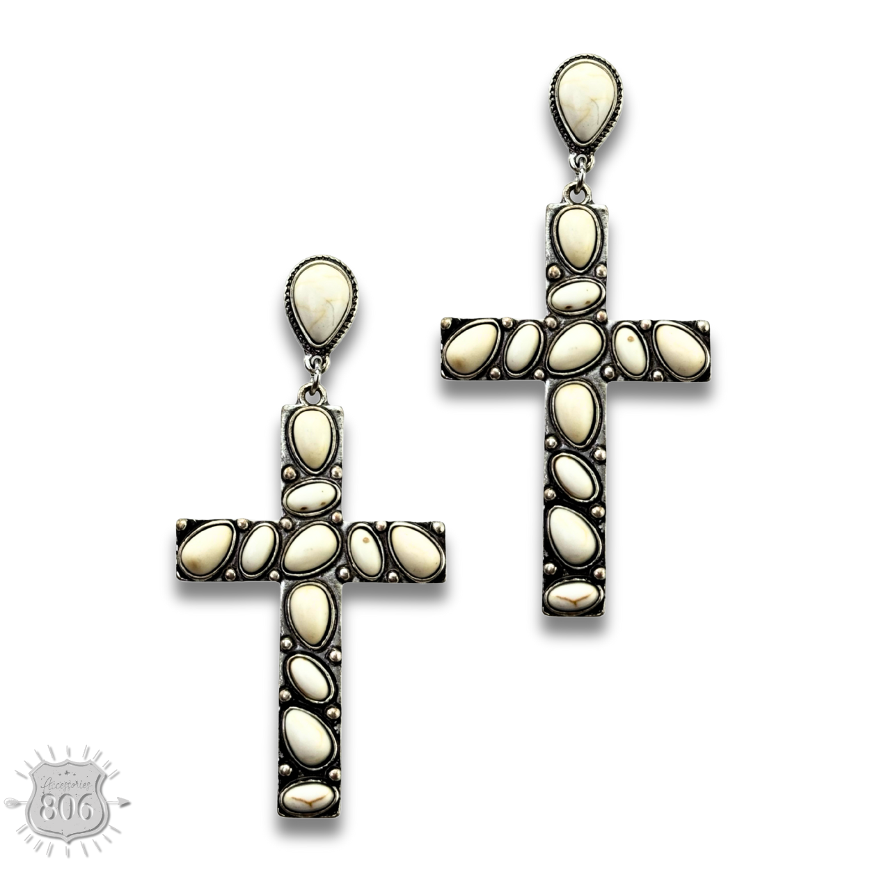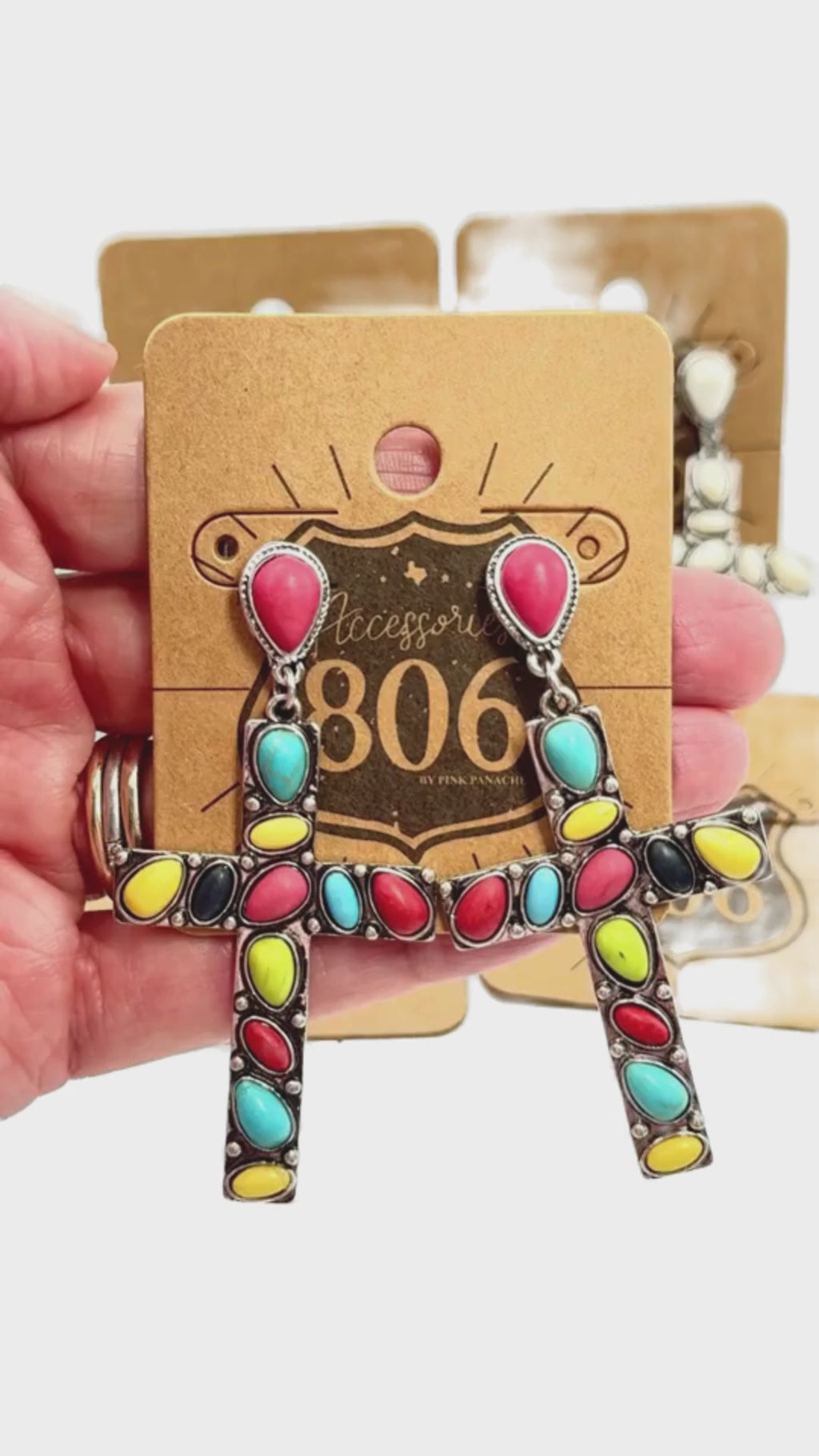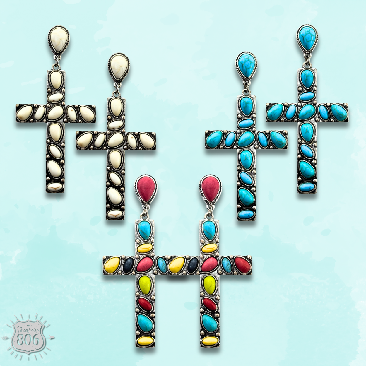 This earring showcases a variety of stone bead shapes, all nestled within a silver color cross setting!