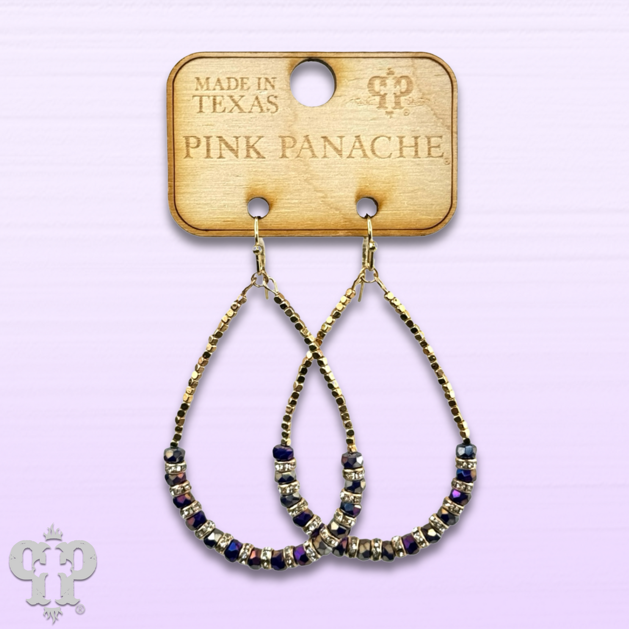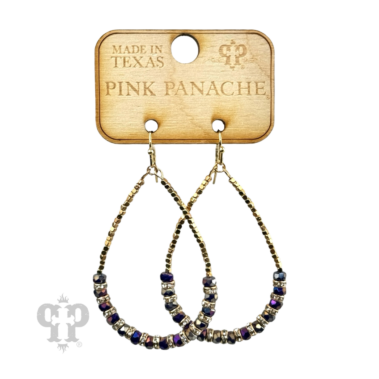 This teardrop earring has tiny gold tone square beads and faceted crystal beads with rhinestone rondelles in between each crystal bead for some extra sparkle.