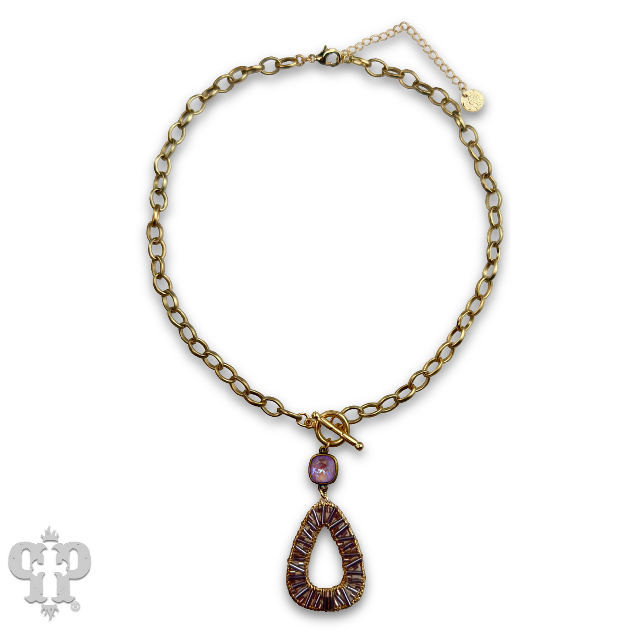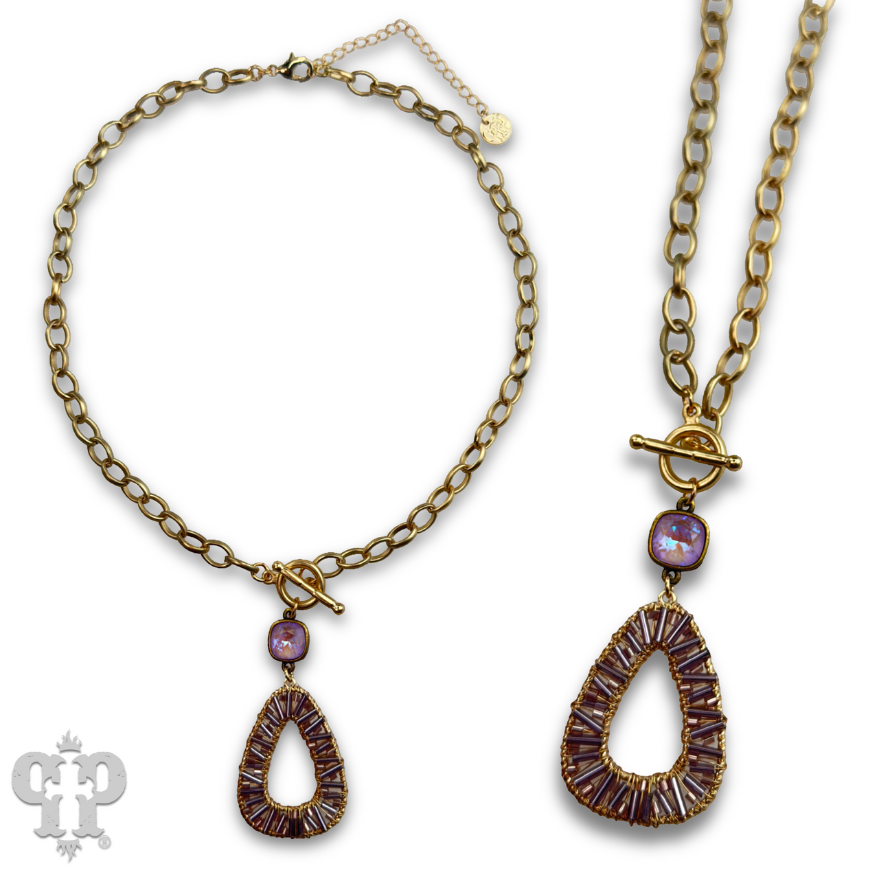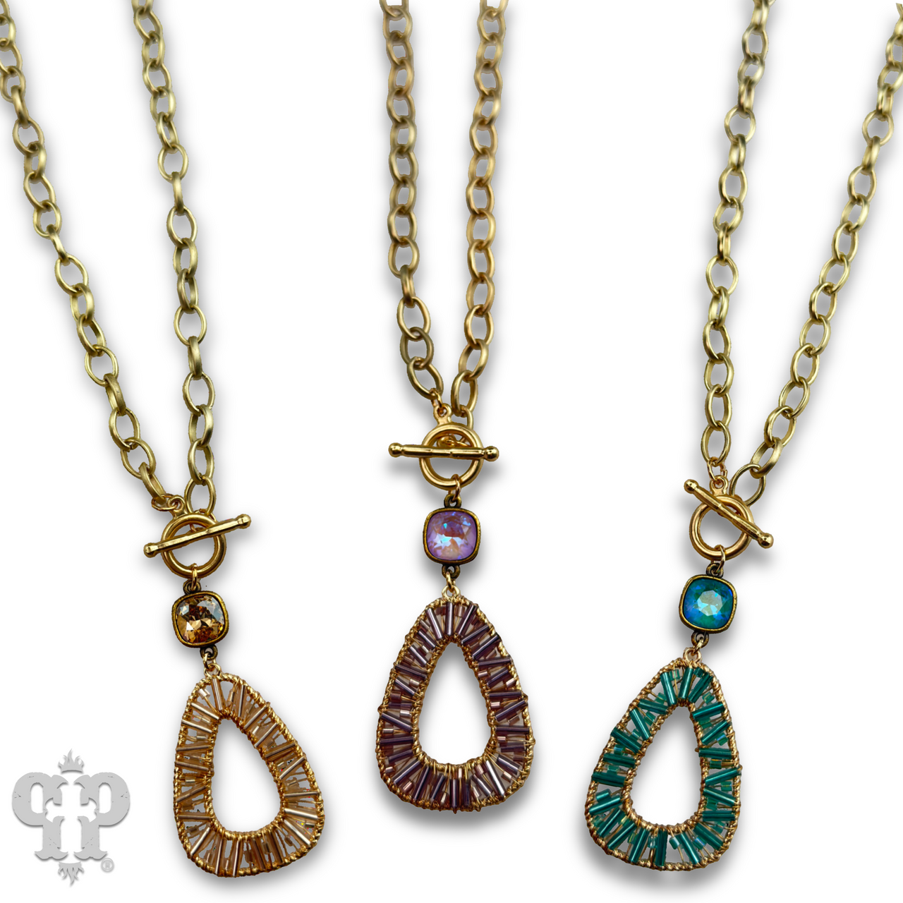 This gold tone chain necklace has a rounded triangle pendant with bugle and tube beads wire wrapped onto it. Connecting the pendant and necklace is an Austrian crystal, in a setting custom made for Pink Panache in the USA. The necklace has a functional toggle clasep in addition to the lobster clasp in back.