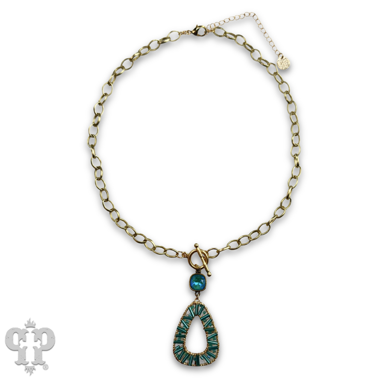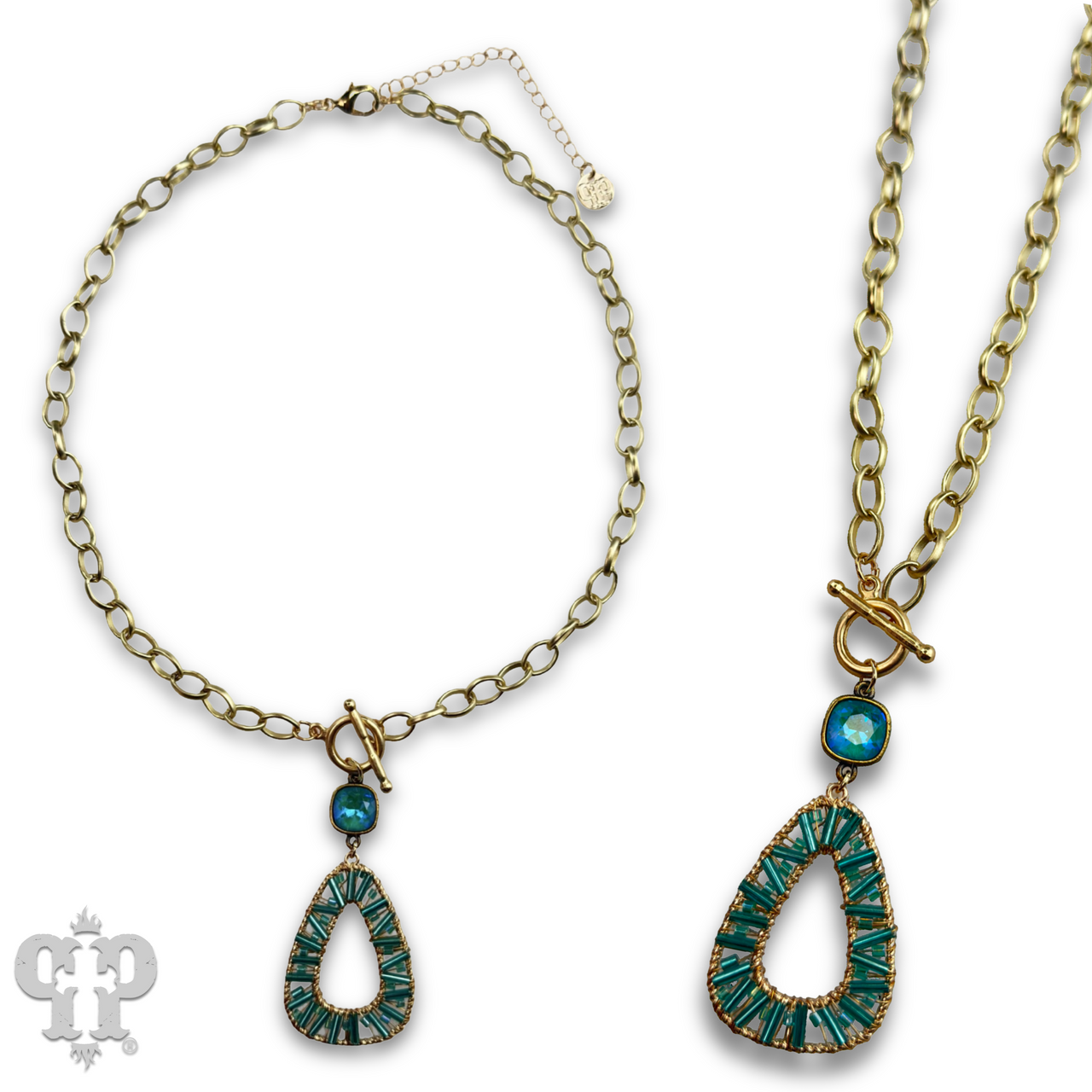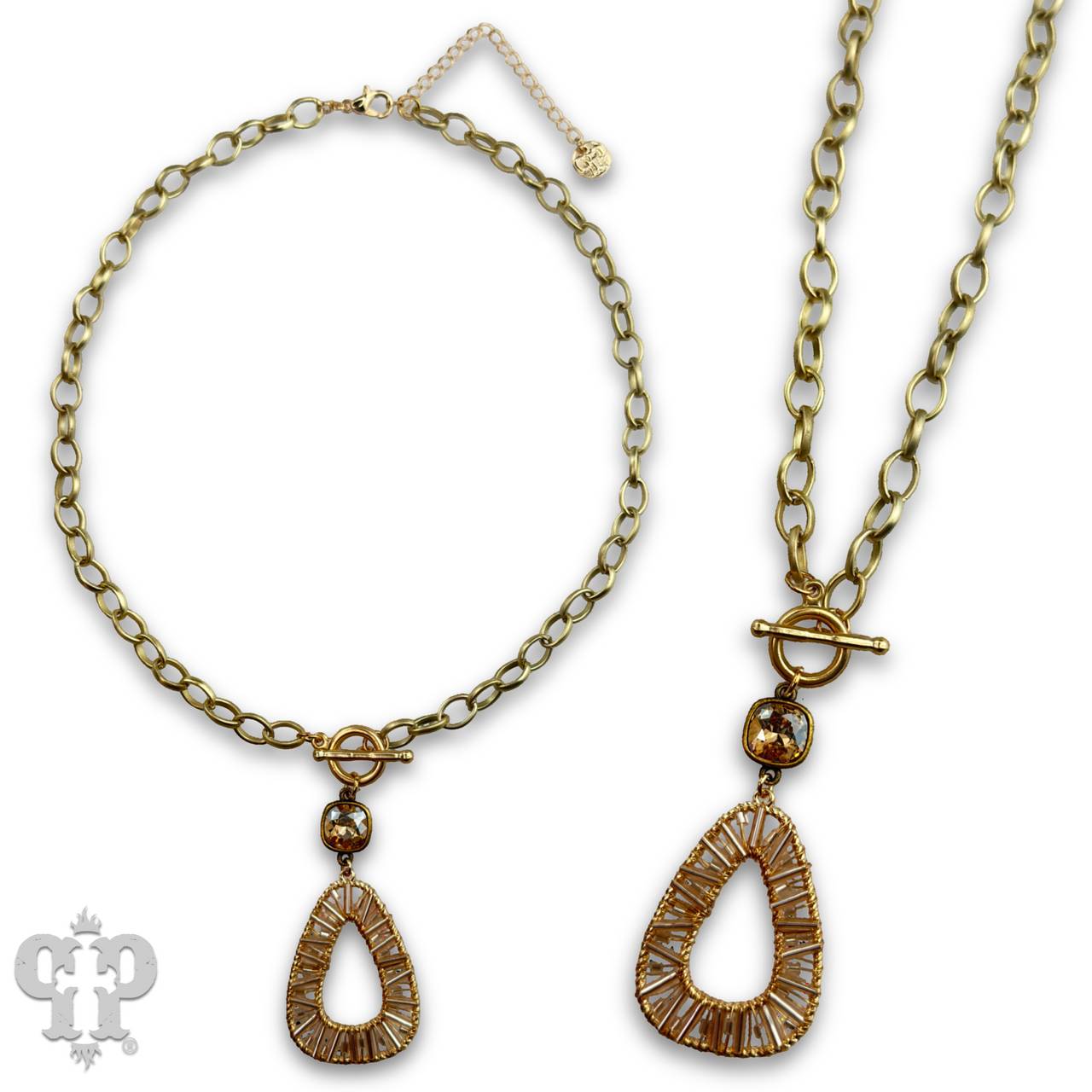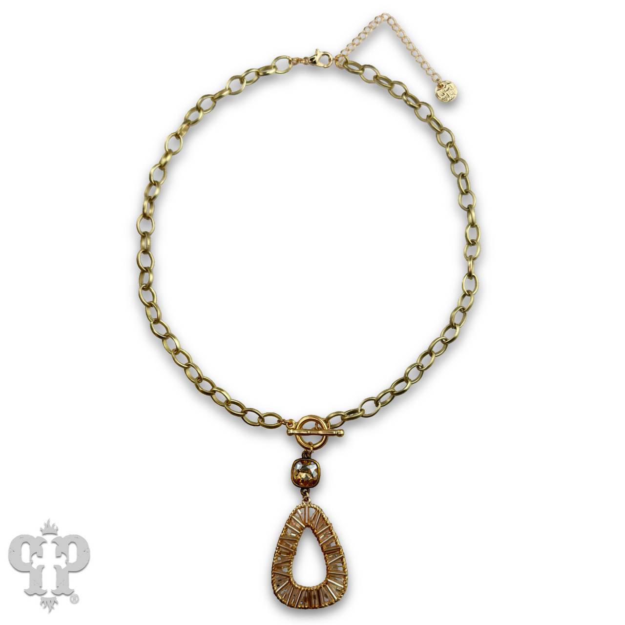 This gold tone chain necklace has a rounded triangle pendant with bugle and tube beads wire wrapped onto it. Connecting the pendant and necklace is an Austrian crystal, in a setting custom made for Pink Panache in the USA. The necklace has a functional toggle clasep in addition to the lobster clasp in back.