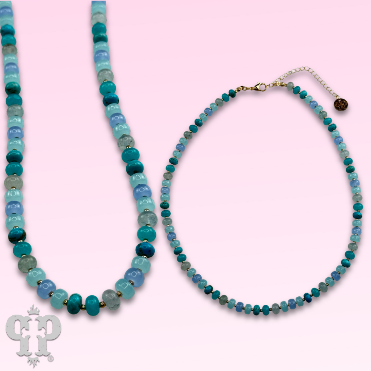 This necklace has a single strand of ombre turquoise color saucer beads. It will layer well with similar pieces or make a statement on its own.