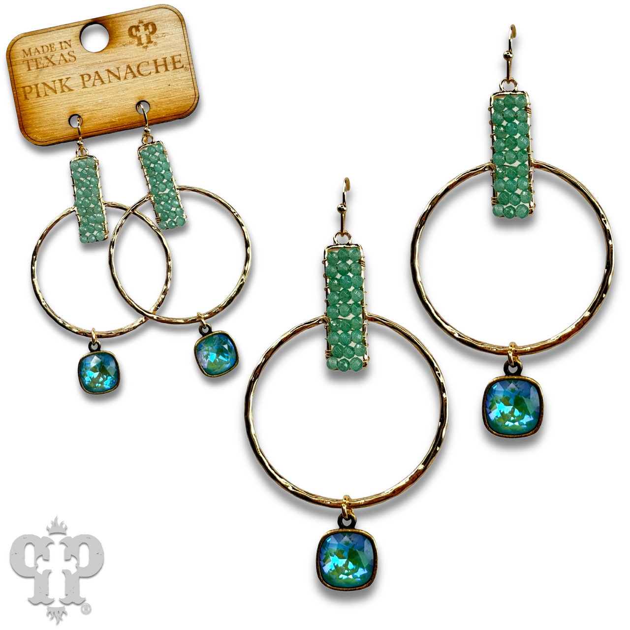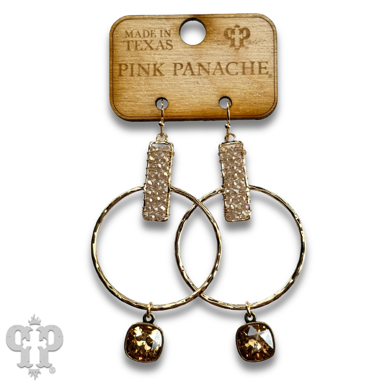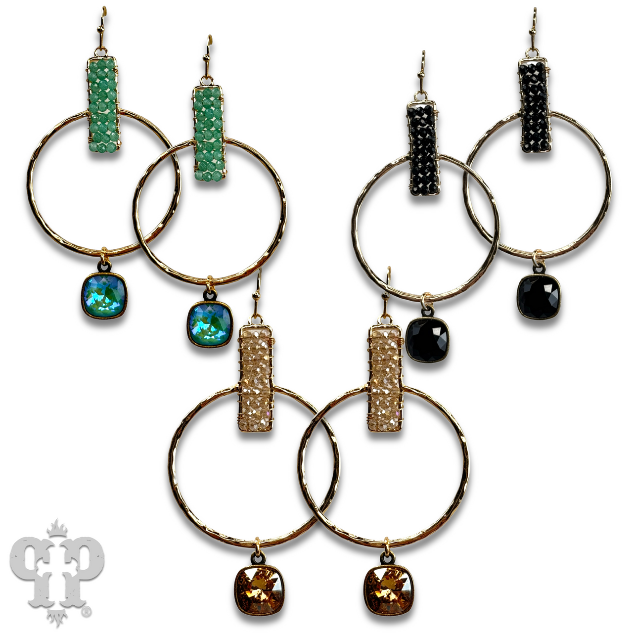 This earring has bar shape with seed beads wire wrapped onto it.  Connected is the twist look gold tone circle with a sparkling Austrian crystal hanging on the bottom.