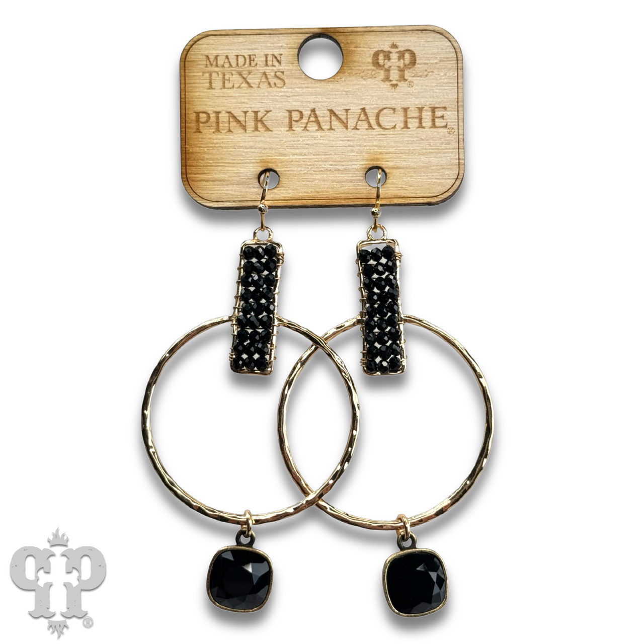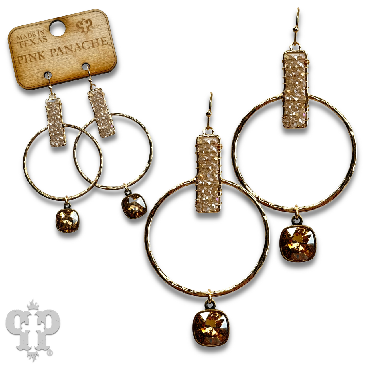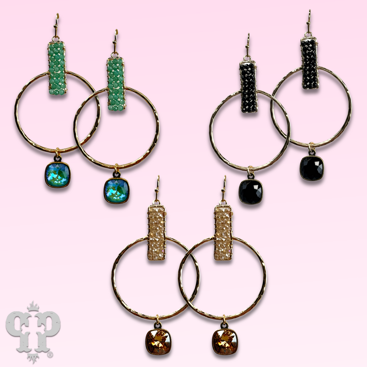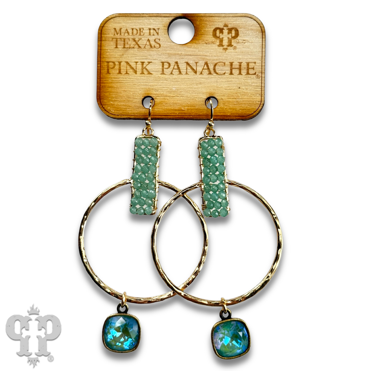 This earring has bar shape with seed beads wire wrapped onto it.  Connected is the twist look gold tone circle with a sparkling Austrian crystal hanging on the bottom.