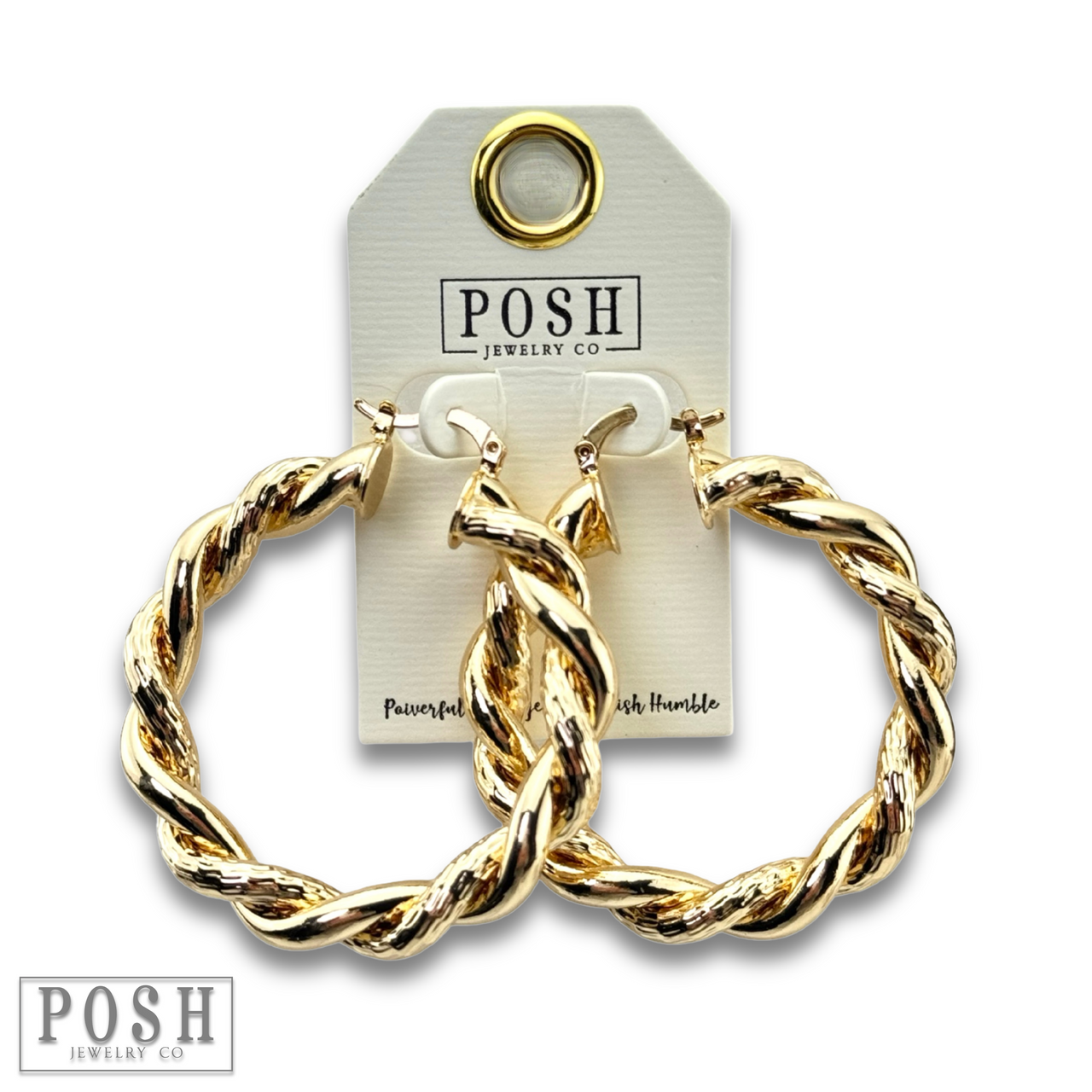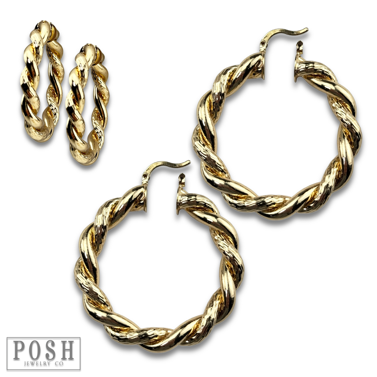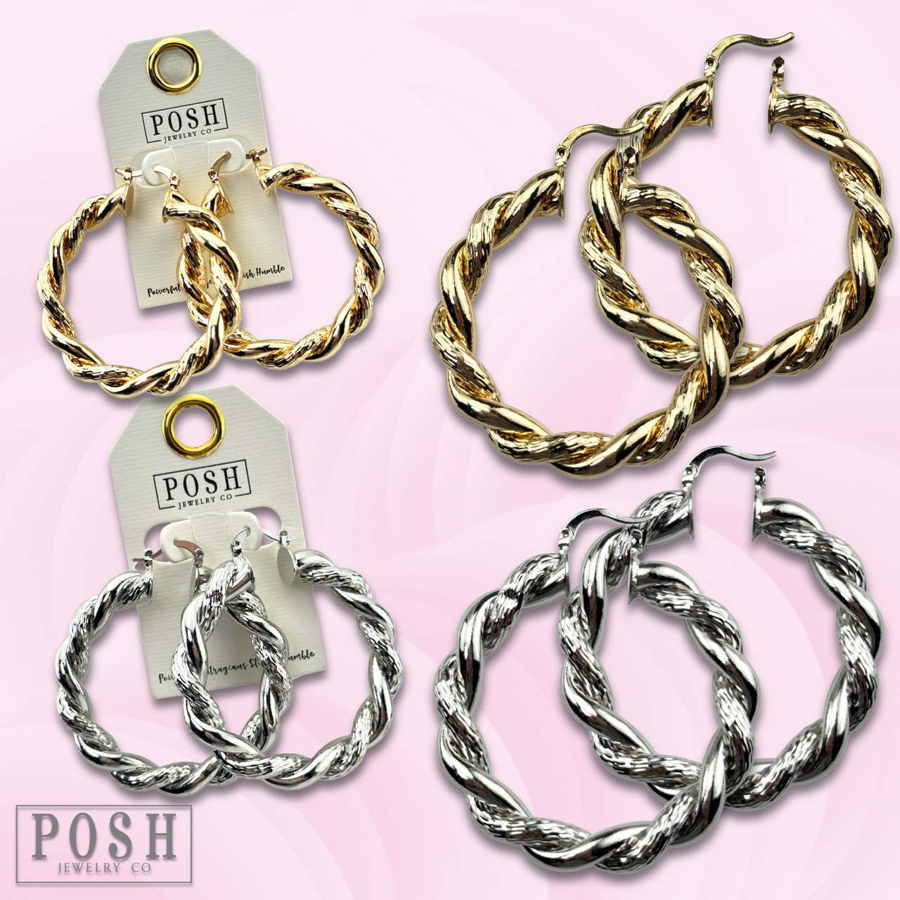 These hoop earrings are hollow, meaning they're lightweight! They have a thick, twisted design and a shiny metallic finish.