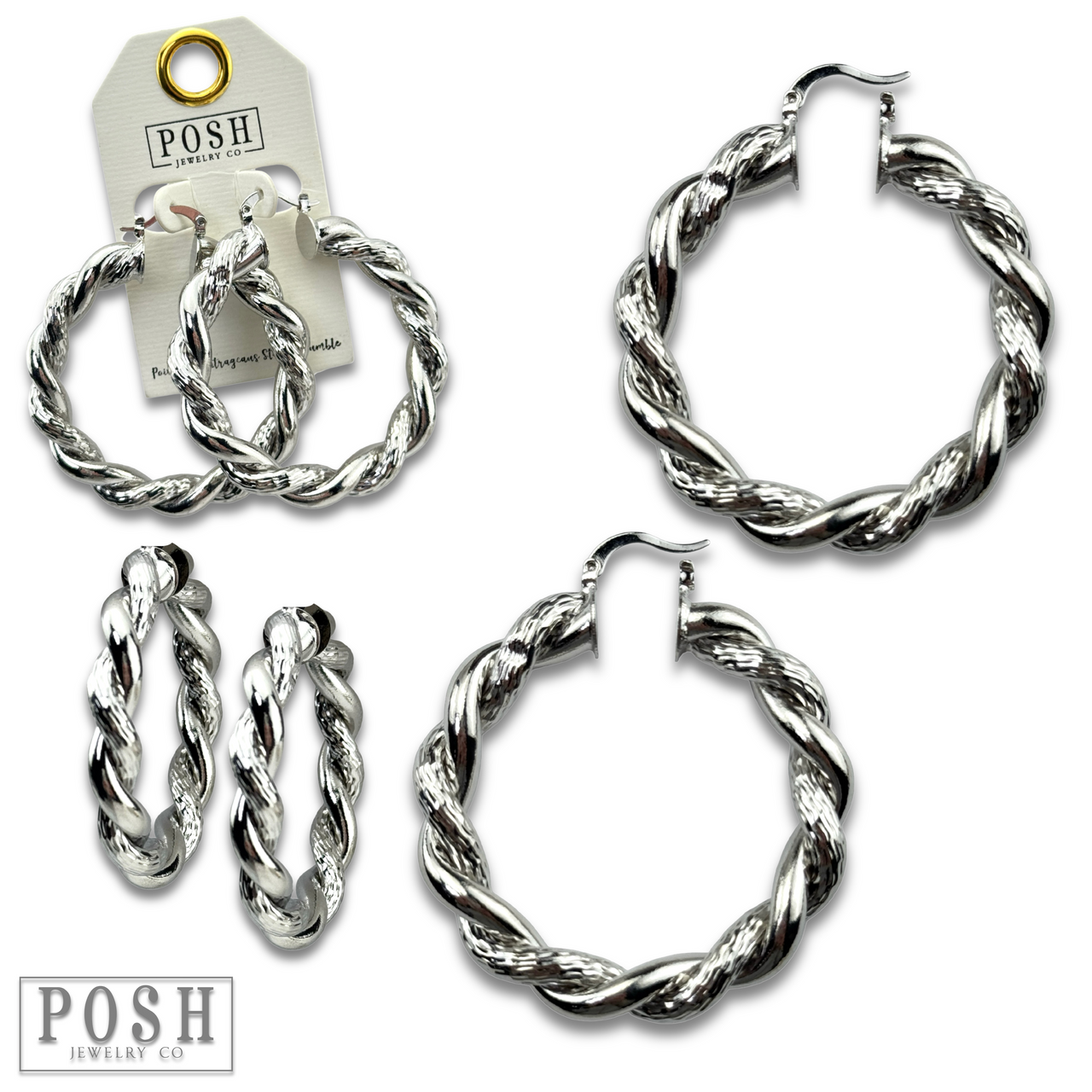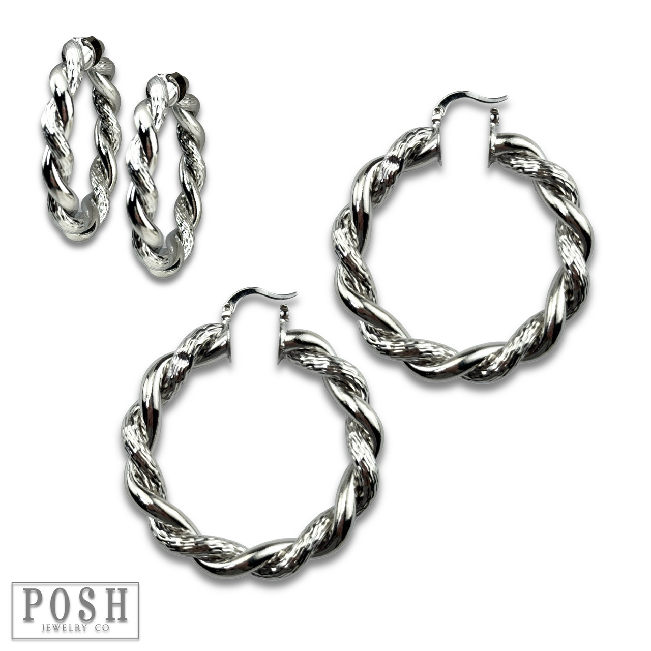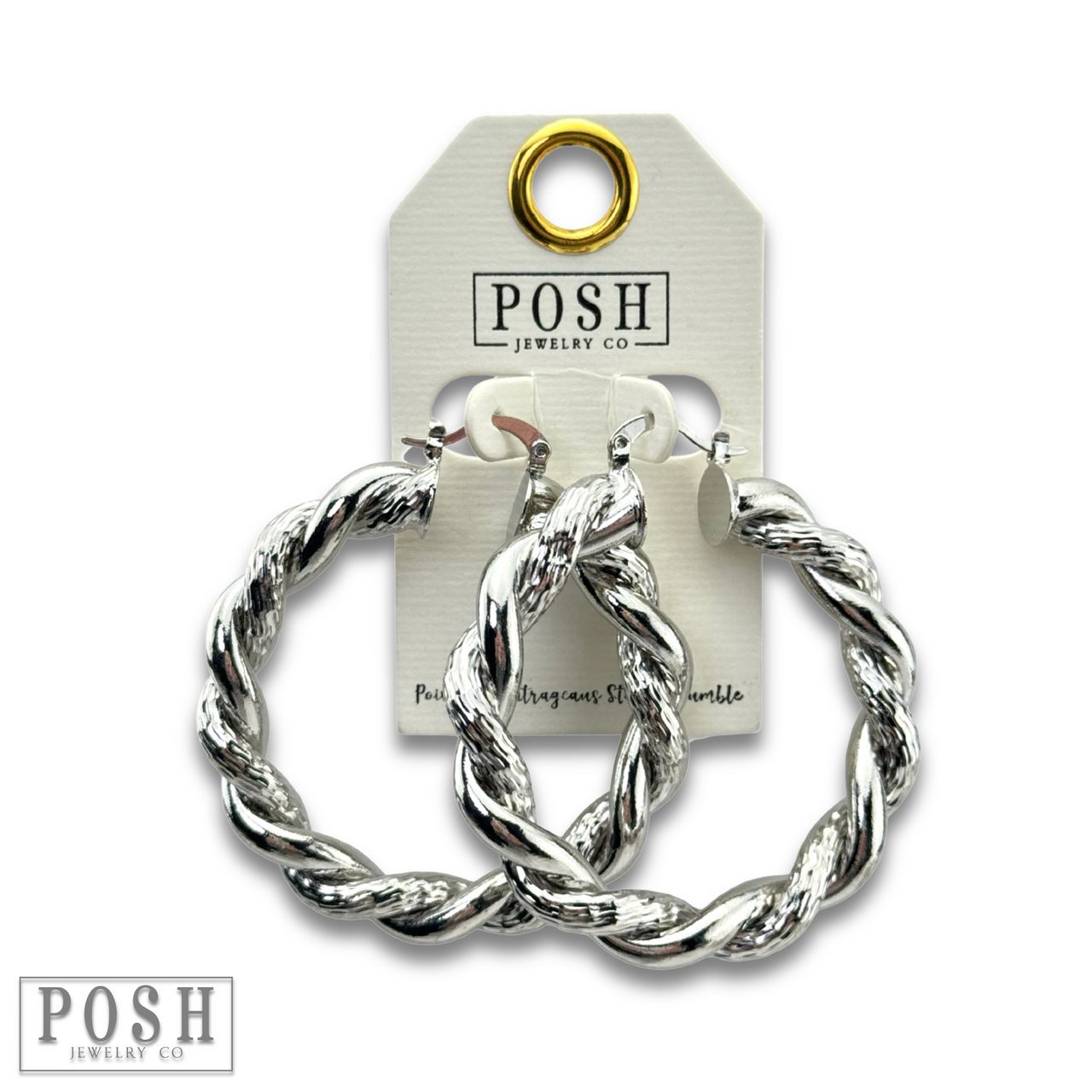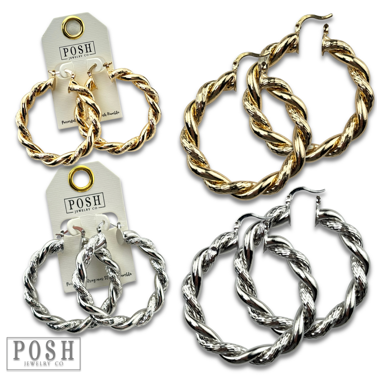 These hoop earrings are hollow, meaning they're lightweight! They have a thick, twisted design and a shiny metallic finish.