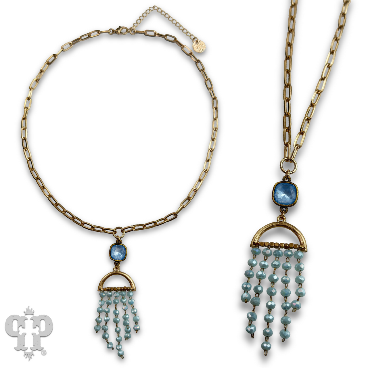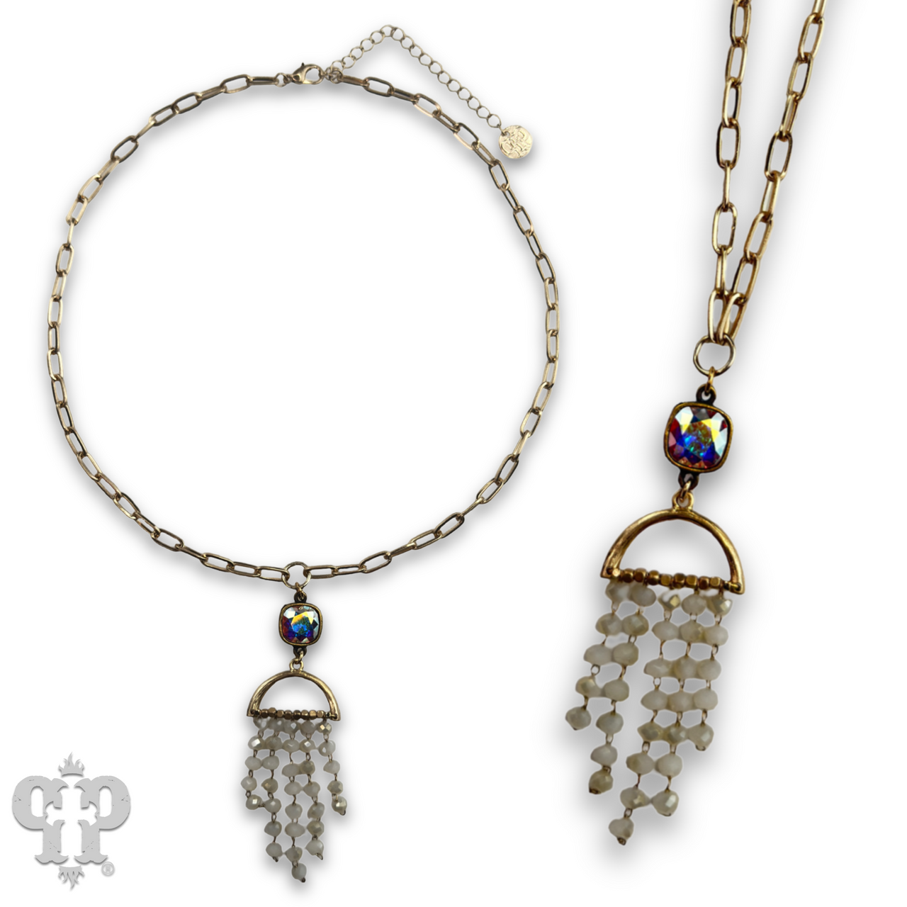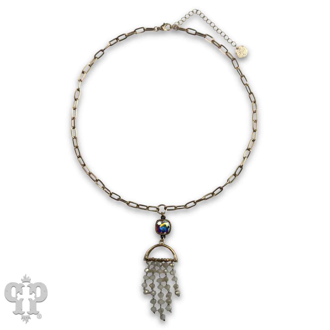 This gold tone chain necklace has a waterfall beaded pendant. Connecting the pendant and necklace is an Austrian crystal, in a setting custom made for Pink Panache in the USA.