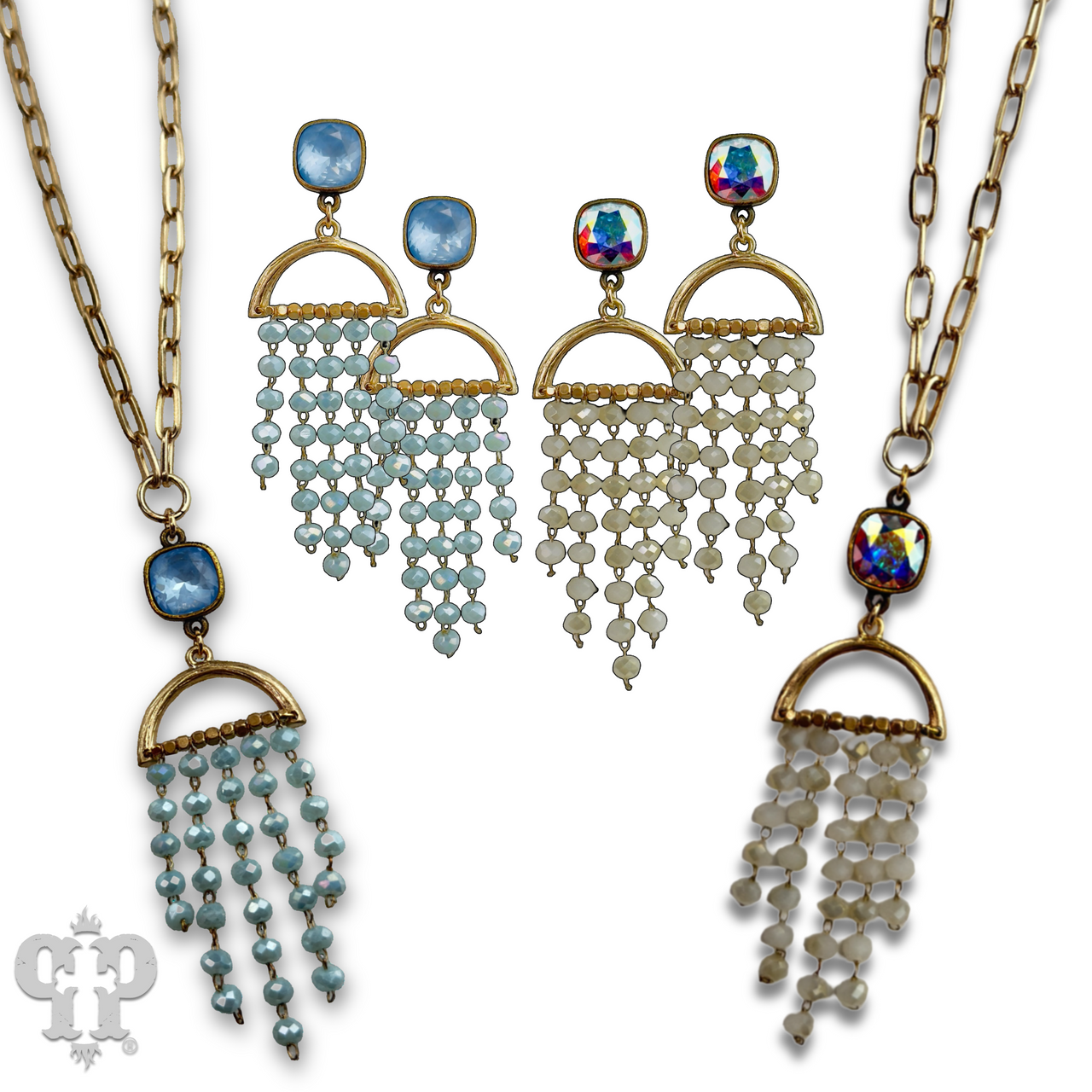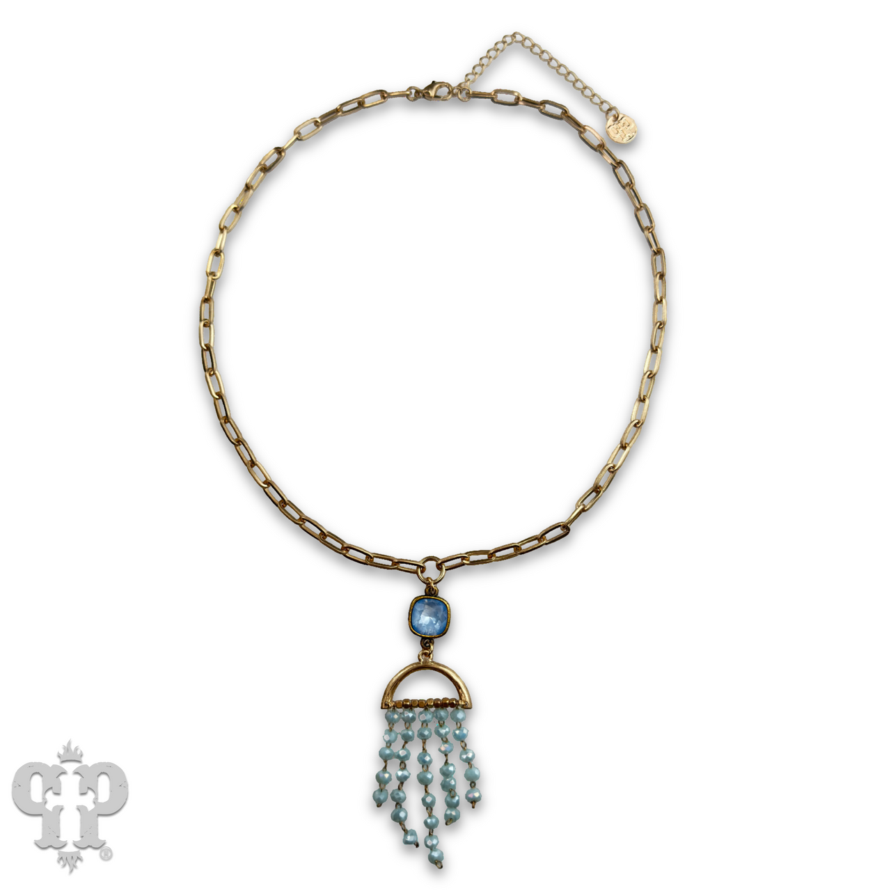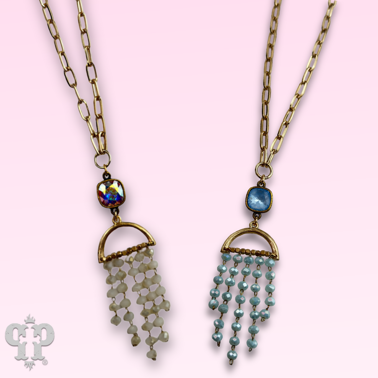 This gold tone chain necklace has a waterfall beaded pendant. Connecting the pendant and necklace is an Austrian crystal, in a setting custom made for Pink Panache in the USA.
