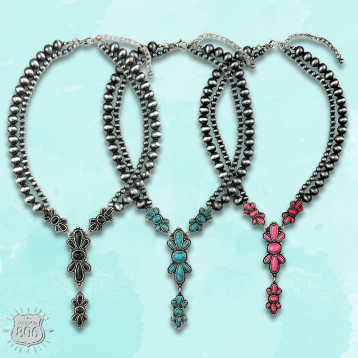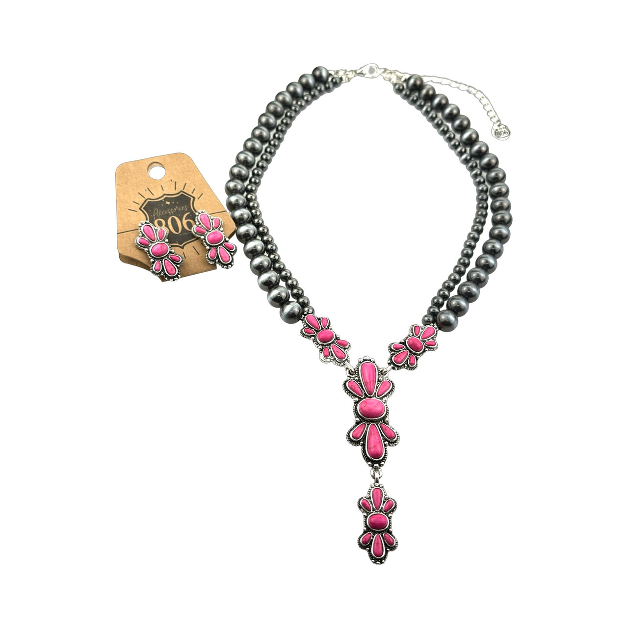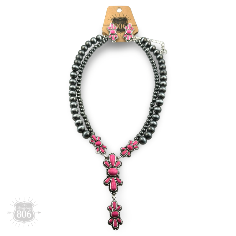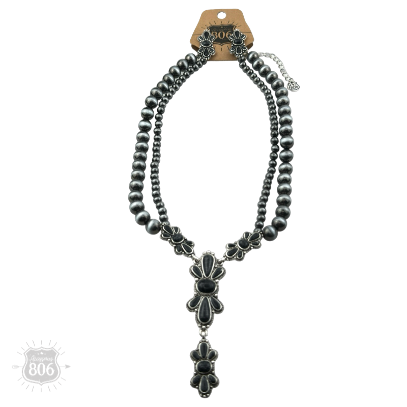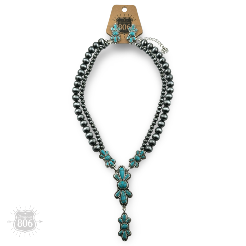 This western style silver tone burnished pearl necklace set has a scalloped butterfly stone concho pendant. The pendant conchos are dyed natural stone so they may vary slightly. The set comes with matching butterfly stone earrings.