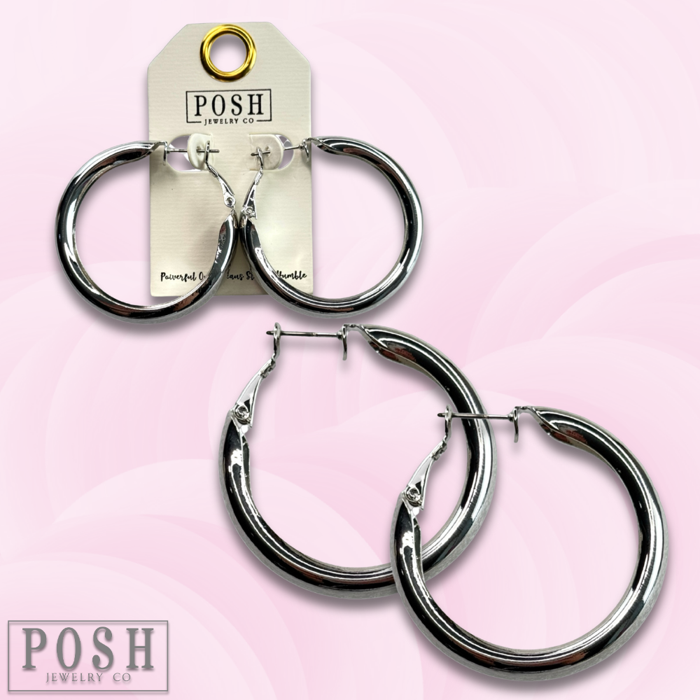 These classic hoop earrings are wide and come in a shiny metal tone.